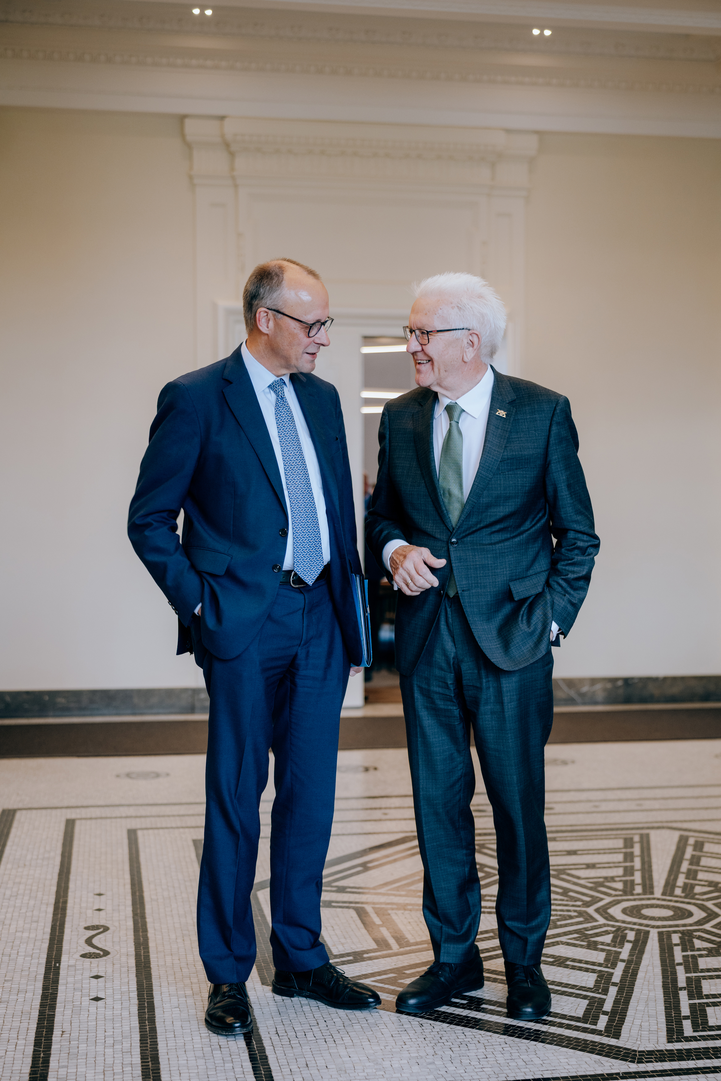 Bundeskanzler Friedrich Merz ist im Rahmen eines Antrittsbesuchs am Dienstag, 21. Oktober 2025, nach Baden-Württemberg gekommen. Ministerpräsident Winfried Kretschmann begrüßte ihn in der Villa Reitzenstein in Stuttgart, wo er zusammen mit dem Staatsminister für Bund-Länder-Zusammenarbeit, Dr. Michael Meister, eine Kabinettssitzung besuchte. Im Anschluss begaben sich der Bundeskanzler und der Ministerpräsident zum Spatenstich für Europas größten KI-Innovationspark, dem IPAI CAMPUS in Heilbronn.