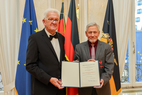 Anlässlich des Tages des Ehrenamtes hat Ministerpräsident Winfried Kretschmann die herausragenden ehrenamtlichen Leistungen von 18 Bürgerinnen und Bürgern gewürdigt und ihnen für ihr Engagement das Bundesverdienstkreuz überreicht.