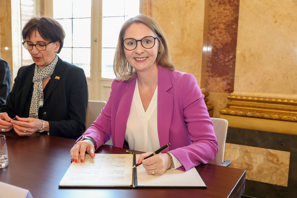 Dr. Nicole Hoffmeister-Kraut, Ministerin für Wirtschaft, Arbeit und Tourismus, bei der Unterzeichnung des Bündnisses