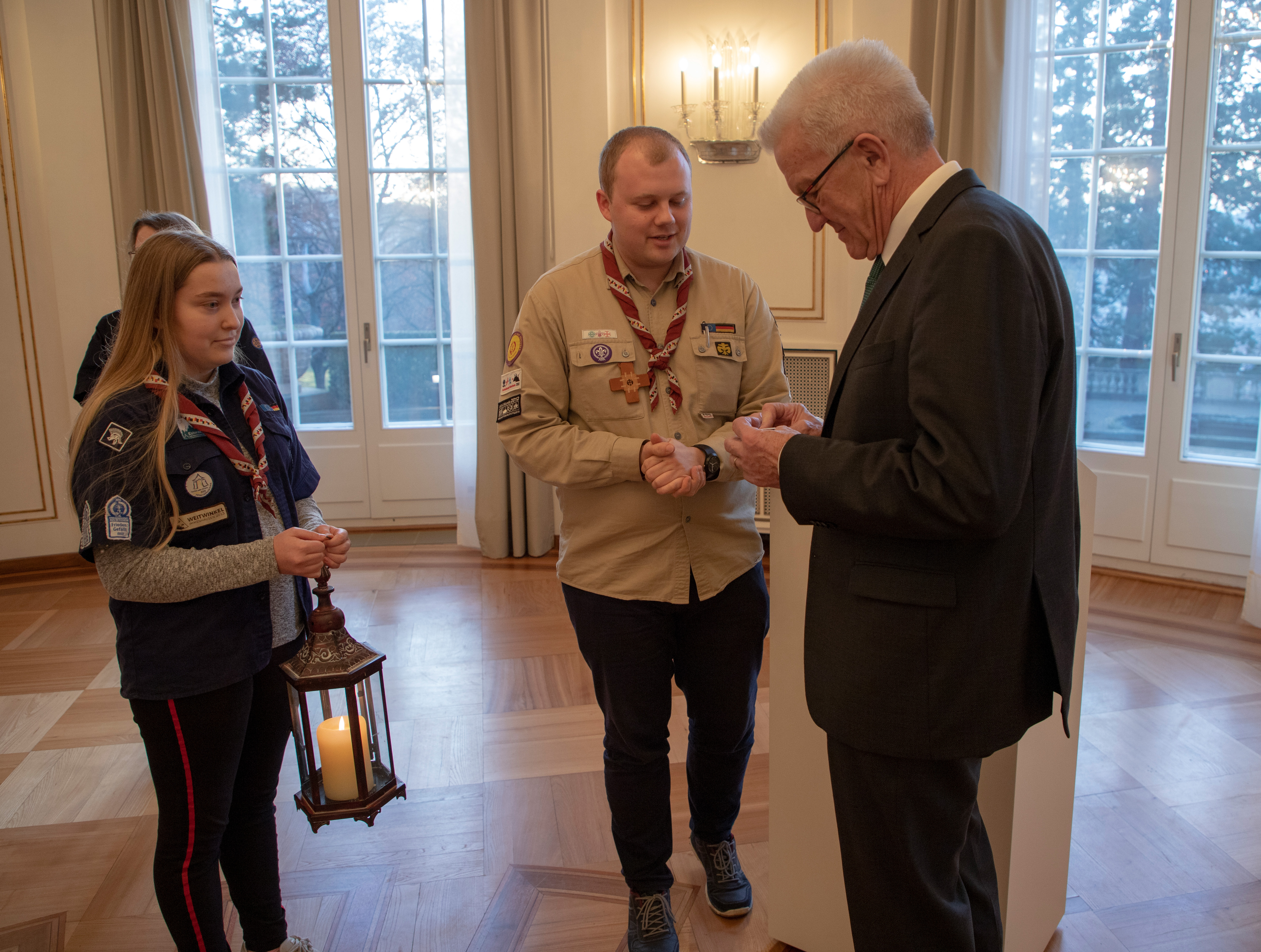 Ministerpräsident Winfried Kretschmann hat in der Villa Reitzenstein in Stuttgart eine Delegation von Pfadfinderinnen und Pfadfindern empfangen, die im Rahmen der Aktion „Friedenslicht“ der Landesregierung das diesjährige Friedenslicht überreicht haben.