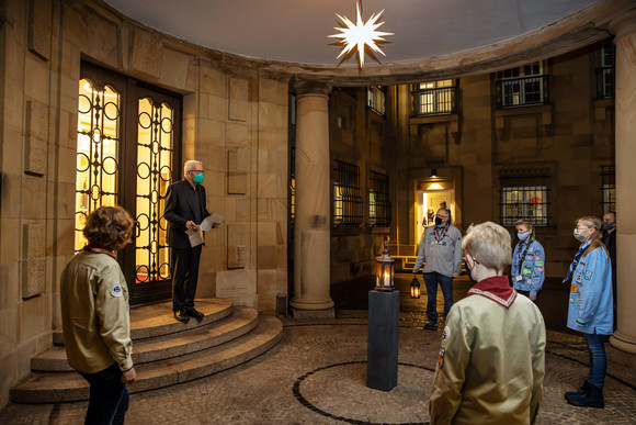 Ministerpräsident Winfried Kretschmann empfing vor der Villa Reitzenstein eine Delegation von Pfadfinderinnen und Pfadfindern, die im Rahmen der Aktion „Friedenslicht“ der Landesregierung das diesjährige Friedenslicht aus Bethlehem überreicht haben.