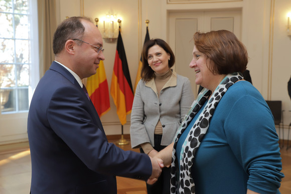 Staatsministerin Theresa Schopper hat den rumänischen Minister für auswärtige Angelegenheiten, Bogdan Aurescu, zu einem Gespräch in der Villa Reitzenstein in Stuttgart empfangen.