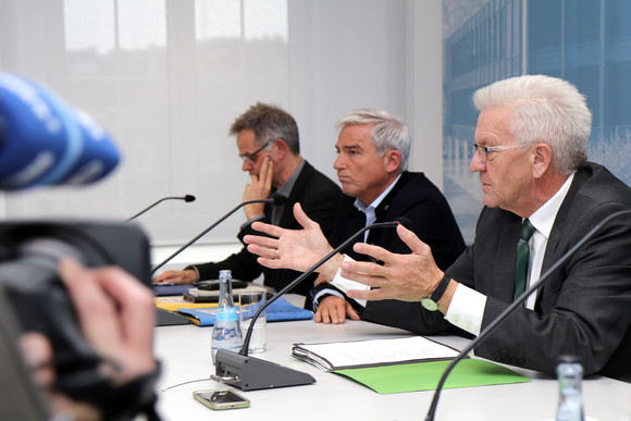 Ministerpräsident Winfried Kretschmann und der stellvertretende Ministerpräsident und Minister für Inneres, Digitalisierung und Migration, Thomas Strobl, haben in der Regierungspressekonferenz in Stuttgart die vom Kabinett beschlossenen neuen Eckpunkte für Landeshilfen nach schweren Naturereignissen und Unglücksfällen vorgestellt und Fragen der Journalisten beantwortet.